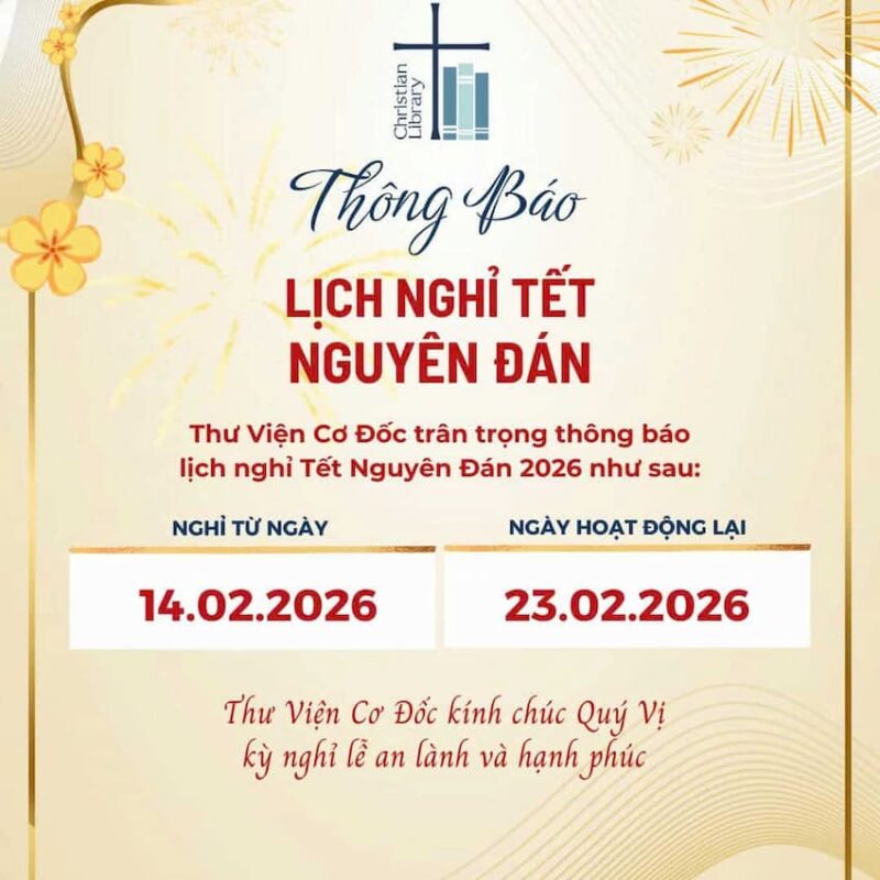 Kính gửi: Quý Bạn Đọc và Thân Hữu Thư Viện Cơ Đốc, Thư Viện Cơ Đốc trân trọng thông báo đến Quý Bạn Đọc và Thân Hữu lịch nghỉ Lễ Giáng Sinh năm 2025, nghỉ Tết Dương Lịch năm 2026 và thời gian làm việc từ ngày 01/01/2026 như sau: 1.    Nghỉ Lễ Giáng Sinh…
